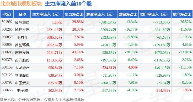 从资金流向上来看,当日北京城市规划板块主力资金净流入2.22亿元,游资资金净流出1.59亿元,散户资金净流出6286.7万元。北京城市规划板块个股资金流向见下表: