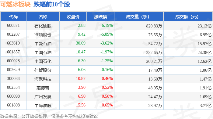 证券之星消息,2月3日可燃冰板块较上一交易日下跌1.2%,石化油服领跌。当日上证指数报收于4067.74,上涨1.29%。深证成指报收于14127.1,上涨2.19%。可燃冰板块个股涨跌见下表: