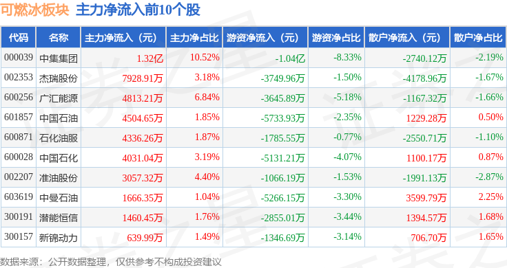 从资金流向上来看,当日可燃冰板块主力资金净流入3.02亿元,游资资金净流出4.03亿元,散户资金净流入1.01亿元。可燃冰板块个股资金流向见下表: