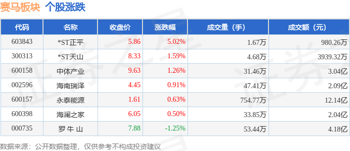 证券之星消息,2月3日赛马板块较上一交易日上涨0.68%,*ST正平领涨。当日上证指数报收于4067.74,上涨1.29%。深证成指报收于14127.1,上涨2.19%。赛马板块个股涨跌见下表: