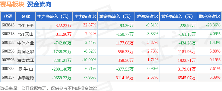 从资金流向上来看,当日赛马板块主力资金净流出1.66亿元,游资资金净流入4584.52万元,散户资金净流入1.2亿元。赛马板块个股资金流向见下表: