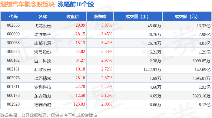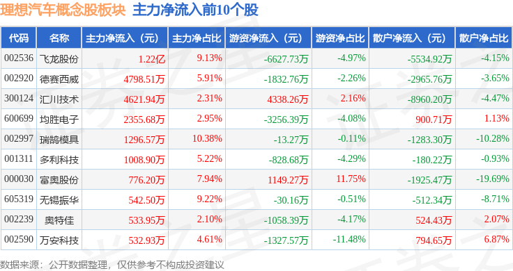 从资金流向上来看,当日理想汽车概念股板块主力资金净流出3.02亿元,游资资金净流出5901.38万元,散户资金净流入3.61亿元。理想汽车概念股板块个股资金流向见下表: