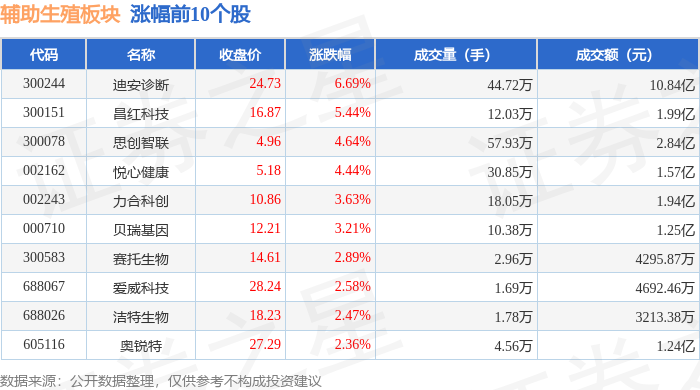证券之星消息,2月3日辅助生殖板块较上一交易日上涨1.71%,迪安诊断领涨。当日上证指数报收于4067.74,上涨1.29%。深证成指报收于14127.1,上涨2.19%。辅助生殖板块个股涨跌见下表: