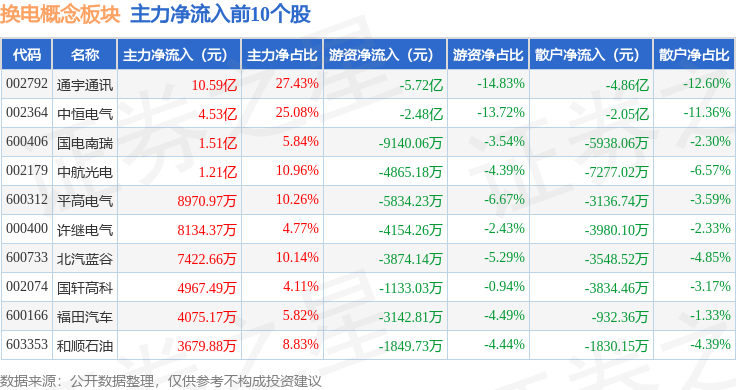 从资金流向上来看,当日换电概念板块主力资金净流入17.73亿元,游资资金净流出10.57亿元,散户资金净流出7.15亿元。换电概念板块个股资金流向见下表: