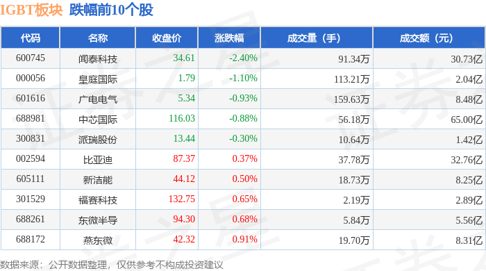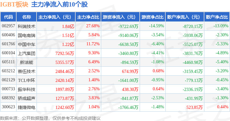 从资金流向上来看,当日IGBT板块主力资金净流出15.48亿元,游资资金净流出2.5亿元,散户资金净流入17.98亿元。IGBT板块个股资金流向见下表: