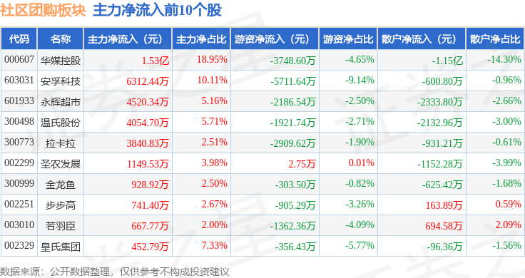 从资金流向上来看,当日社区团购板块主力资金净流入6942.42万元,游资资金净流出1.92亿元,散户资金净流入1.23亿元。社区团购板块个股资金流向见下表: