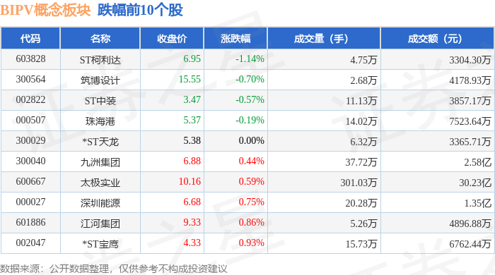 从资金流向上来看,当日BIPV概念板块主力资金净流入12.53亿元,游资资金净流出4.89亿元,散户资金净流出7.64亿元。BIPV概念板块个股资金流向见下表:
