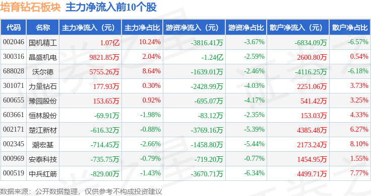 从资金流向上来看,当日培育钻石板块主力资金净流出5.9亿元,游资资金净流出7494.36万元,散户资金净流入6.65亿元。培育钻石板块个股资金流向见下表: