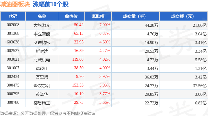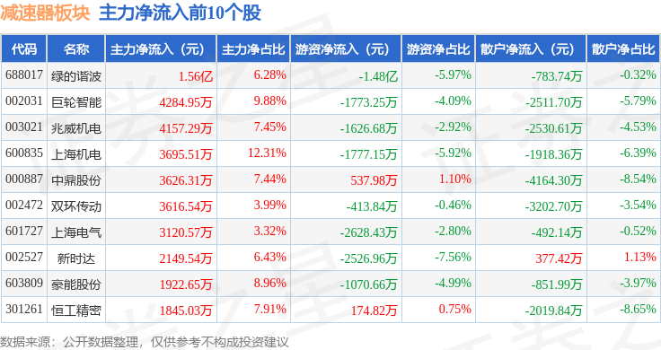 从资金流向上来看,当日减速器板块主力资金净流出4288.82万元,游资资金净流出3599.07万元,散户资金净流入7887.89万元。减速器板块个股资金流向见下表: