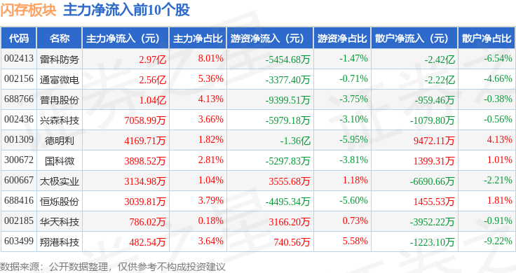 从资金流向上来看,当日闪存板块主力资金净流出13.25亿元,游资资金净流出1.16亿元,散户资金净流入14.41亿元。闪存板块个股资金流向见下表: