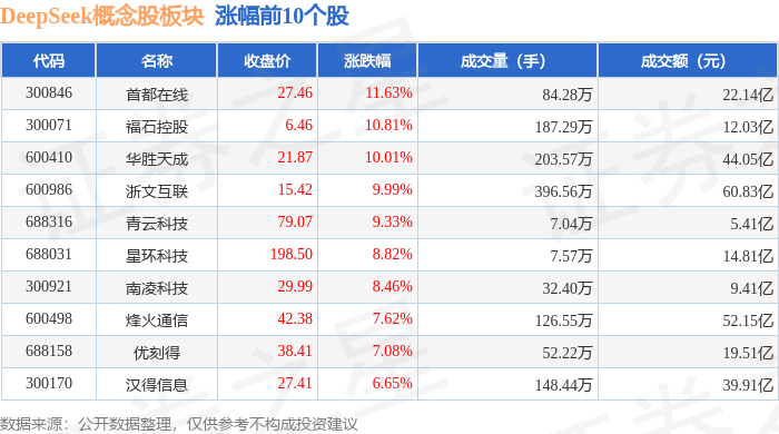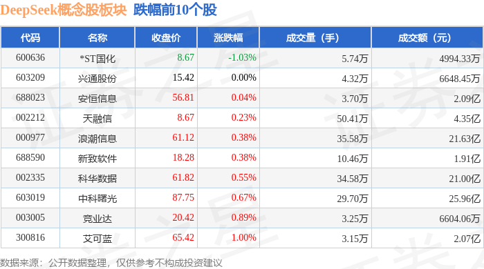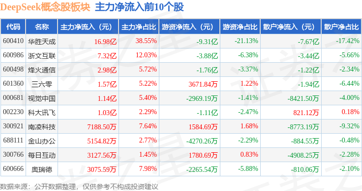 从资金流向上来看,当日DeepSeek概念股板块主力资金净流入17.23亿元,游资资金净流出21.38亿元,散户资金净流入4.15亿元。DeepSeek概念股板块个股资金流向见下表: