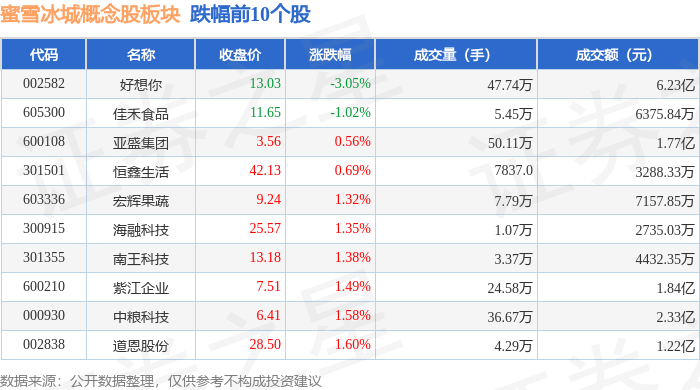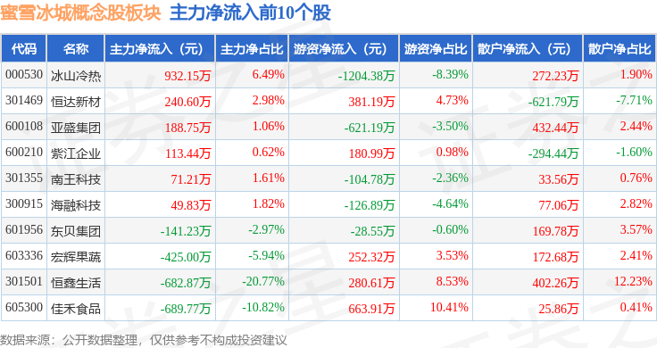 从资金流向上来看,当日蜜雪冰城概念股板块主力资金净流出1.11亿元,游资资金净流入1756.53万元,散户资金净流入9355.83万元。蜜雪冰城概念股板块个股资金流向见下表: