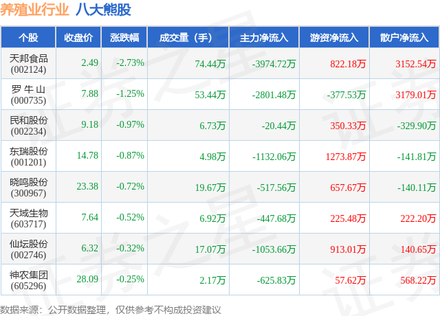 个股表现方面,养殖业行业当日领跌股为天邦食品(002124),该股当日报收2.49,下跌2.73%,成交量74.44万,主力资金净流出3974.72万元。罗 牛 山(000735)以下跌1.25%紧随其后,该股当日成交量53.44万,主力资金净流出2801.48万元。除此之外,民和股份(002234)、东瑞股份(001201)、晓鸣股份(300967)均进入当日熊股之列。具体个股列表见下表:
