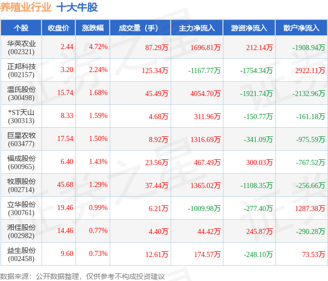个股表现方面,养殖业行业当日领涨股为华英农业(002321),该股当日报收2.44,上涨4.72%,成交量87.29万,主力资金净流入1696.81万元。正邦科技(002157)以上涨2.24%紧随其后,该股当日成交量125.34万,主力资金净流出1167.77万元。除此之外,温氏股份(300498)、*ST天山(300313)、巨星农牧(603477)均进入当日牛股之列。具体个股列表见下表: