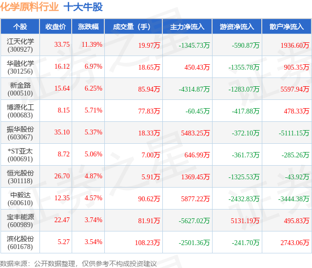 个股表现方面,化学原料行业当日领涨股为江天化学(300927),该股当日报收33.75,上涨11.39%,成交量19.97万,主力资金净流出1345.73万元。华融化学(301256)以上涨6.97%紧随其后,该股当日成交量18.65万,主力资金净流入450.43万元。除此之外,新金路(000510)、博源化工(000683)、振华股份(603067)均进入当日牛股之列。具体个股列表见下表: