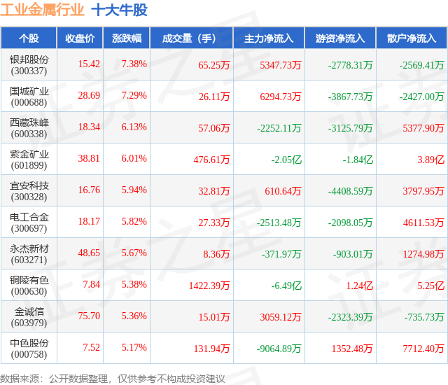 个股表现方面,工业金属行业当日领涨股为银邦股份(300337),该股当日报收15.42,上涨7.38%,成交量65.25万,主力资金净流入5347.73万元。国城矿业(000688)以上涨7.29%紧随其后,该股当日成交量26.11万,主力资金净流入6294.73万元。除此之外,西藏珠峰(600338)、紫金矿业(601899)、宜安科技(300328)均进入当日牛股之列。具体个股列表见下表: