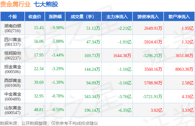 个股表现方面,贵金属行业当日领跌股为湖南白银(002716),该股当日报收15.43,下跌9.98%,成交量51.12万,主力资金净流出2.21亿元。四川黄金(001337)以下跌5.88%紧随其后,该股当日成交量47.34万,主力资金净流出1.91亿元。除此之外,恒邦股份(002237)、招金黄金(000506)、西部黄金(601069)均进入当日熊股之列。具体个股列表见下表: