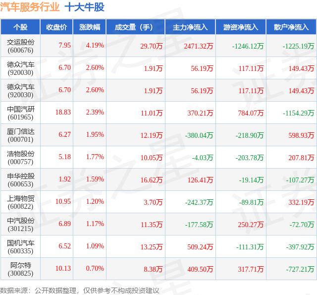 个股表现方面,汽车服务行业当日领涨股为交运股份(600676),该股当日报收7.95,上涨4.19%,成交量29.7万,主力资金净流入2471.32万元。德众汽车(920030)以上涨2.6%紧随其后,该股当日成交量1.91万,主力资金净流入56.19万元。除此之外,德众汽车(920030)、中国汽研(601965)、厦门信达(000701)均进入当日牛股之列。具体个股列表见下表:
