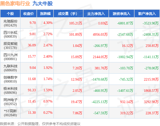 个股表现方面,黑色家电行业当日领涨股为兆驰股份(002429),该股当日报收9.7,上涨4.3%,成交量105.21万,主力资金净流入1.03亿元。四川长虹(600839)以上涨2.72%紧随其后,该股当日成交量101.89万,主力资金净流入4956.03万元。除此之外,辰奕智能(301578)、四川九洲(000801)、九联科技(688609)均进入当日牛股之列。具体个股列表见下表: