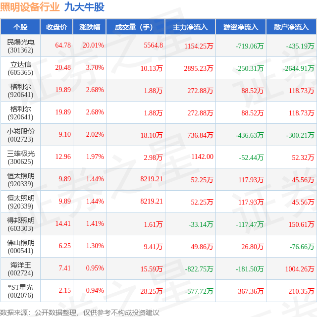 个股表现方面,照明设备行业当日领涨股为民爆光电(301362),该股当日报收64.78,上涨20.01%,成交量5565.0,主力资金净流入1154.25万元。立达信(605365)以上涨3.7%紧随其后,该股当日成交量10.13万,主力资金净流入2895.23万元。除此之外,格利尔(920641)、格利尔(920641)、小崧股份(002723)均进入当日牛股之列。具体个股列表见下表: