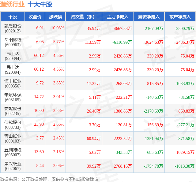 个股表现方面,造纸行业当日领涨股为凯恩股份(002012),该股当日报收6.91,上涨10.03%,成交量35.94万,主力资金净流入4667.88万元。岳阳林纸(600963)以上涨5.77%紧随其后,该股当日成交量113.59万,主力资金净流出6110.99万元。除此之外,民士达(920394)、民士达(920394)、恒丰纸业(600356)均进入当日牛股之列。具体个股列表见下表: