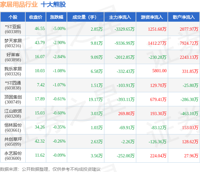 个股表现方面,家居用品行业当日领跌股为*ST亚振(603389),该股当日报收46.55,下跌5.0%,成交量2.85万,主力资金净流出3329.65万元。梦天家居(603216)以下跌2.9%紧随其后,该股当日成交量9.81万,主力资金净流出9336.99万元。除此之外,好莱客(603898)、我乐家居(603326)、*ST四通(603838)均进入当日熊股之列。具体个股列表见下表:
