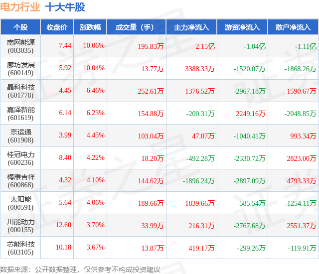 个股表现方面,电力行业当日领涨股为南网能源(003035),该股当日报收7.44,上涨10.06%,成交量195.83万,主力资金净流入2.15亿元。廊坊发展(600149)以上涨10.04%紧随其后,该股当日成交量13.77万,主力资金净流入3388.33万元。除此之外,晶科科技(601778)、嘉泽新能(601619)、京运通(601908)均进入当日牛股之列。具体个股列表见下表: