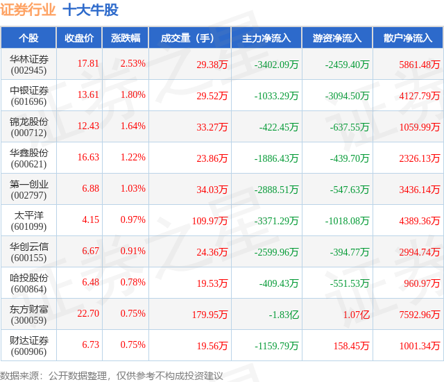 个股表现方面,证券行业当日领涨股为华林证券(002945),该股当日报收17.81,上涨2.53%,成交量29.38万,主力资金净流出3402.09万元。中银证券(601696)以上涨1.8%紧随其后,该股当日成交量29.52万,主力资金净流出1033.29万元。除此之外,锦龙股份(000712)、华鑫股份(600621)、第一创业(002797)均进入当日牛股之列。具体个股列表见下表: