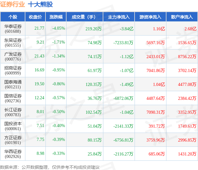 个股表现方面,证券行业当日领跌股为华泰证券(601688),该股当日报收21.77,下跌4.05%,成交量219.2万,主力资金净流出3.84亿元。东吴证券(601555)以下跌1.71%紧随其后,该股当日成交量74.98万,主力资金净流出7233.81万元。除此之外,广发证券(000776)、招商证券(600999)、国泰海通(601211)均进入当日熊股之列。具体个股列表见下表: