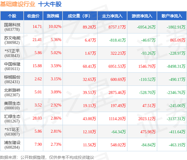 个股表现方面,基础建设行业当日领涨股为国晟科技(603778),该股当日报收14.71,上涨10.02%,成交量89.28万,主力资金净流入8757.17万元。苏文电能(300982)以上涨5.36%紧随其后,该股当日成交量6.47万,主力资金净流出818.41万元。除此之外,*ST正平(603843)、中国核建(601611)、棕榈股份(002431)均进入当日牛股之列。具体个股列表见下表: