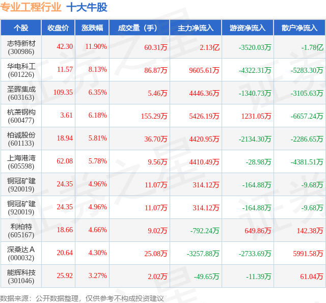 个股表现方面,专业工程行业当日领涨股为志特新材(300986),该股当日报收42.3,上涨11.9%,成交量60.31万,主力资金净流入2.13亿元。华电科工(601226)以上涨8.13%紧随其后,该股当日成交量86.87万,主力资金净流入9605.61万元。除此之外,圣晖集成(603163)、杭萧钢构(600477)、柏诚股份(601133)均进入当日牛股之列。具体个股列表见下表: