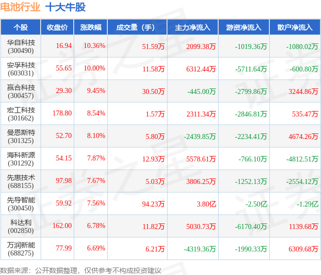 个股表现方面,电池行业当日领涨股为华自科技(300490),该股当日报收16.94,上涨10.36%,成交量51.59万,主力资金净流入2099.38万元。安孚科技(603031)以上涨10.0%紧随其后,该股当日成交量11.58万,主力资金净流入6312.44万元。除此之外,赢合科技(300457)、宏工科技(301662)、曼恩斯特(301325)均进入当日牛股之列。具体个股列表见下表: