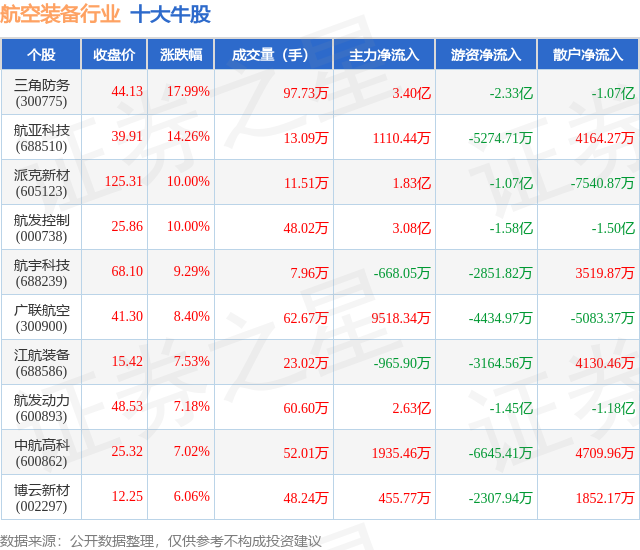 个股表现方面,航空装备行业当日领涨股为三角防务(300775),该股当日报收44.13,上涨17.99%,成交量97.73万,主力资金净流入3.4亿元。航亚科技(688510)以上涨14.26%紧随其后,该股当日成交量13.09万,主力资金净流入1110.44万元。除此之外,派克新材(605123)、航发控制(000738)、航宇科技(688239)均进入当日牛股之列。具体个股列表见下表: