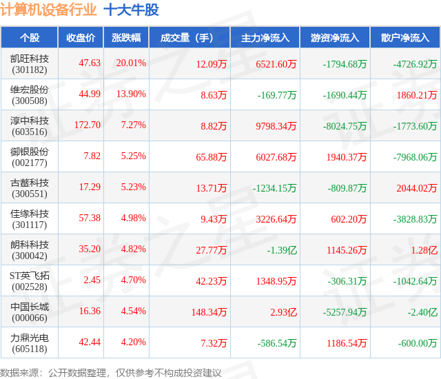 个股表现方面,计算机设备行业当日领涨股为凯旺科技(301182),该股当日报收47.63,上涨20.01%,成交量12.09万,主力资金净流入6521.6万元。维宏股份(300508)以上涨13.9%紧随其后,该股当日成交量8.63万,主力资金净流出169.77万元。除此之外,淳中科技(603516)、御银股份(002177)、古鳌科技(300551)均进入当日牛股之列。具体个股列表见下表: