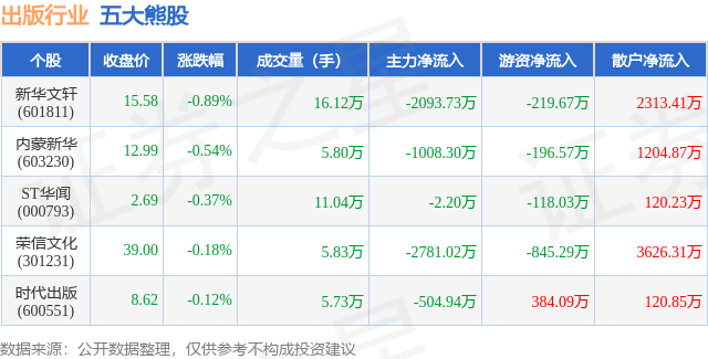 个股表现方面,出版行业当日领跌股为新华文轩(601811),该股当日报收15.58,下跌0.89%,成交量16.12万,主力资金净流出2093.73万元。内蒙新华(603230)以下跌0.54%紧随其后,该股当日成交量5.8万,主力资金净流出1008.3万元。除此之外,ST华闻(000793)、荣信文化(301231)、时代出版(600551)均进入当日熊股之列。具体个股列表见下表: