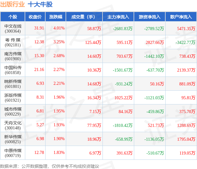 个股表现方面,出版行业当日领涨股为中文在线(300364),该股当日报收31.91,上涨4.01%,成交量58.87万,主力资金净流出2681.83万元。粤 传 媒(002181)以上涨3.25%紧随其后,该股当日成交量125.44万,主力资金净流入595.11万元。除此之外,南方传媒(601900)、中国科传(601858)、皖新传媒(601801)均进入当日牛股之列。具体个股列表见下表: