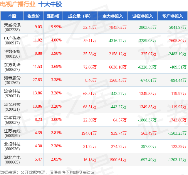 个股表现方面,电视广播行业当日领涨股为天威视讯(002238),该股当日报收9.03,上涨9.99%,成交量32.48万,主力资金净流入7845.62万元。电广传媒(000917)以上涨4.06%紧随其后,该股当日成交量59.11万,主力资金净流出4316.72万元。除此之外,华数传媒(000156)、东方明珠(600637)、海看股份(301262)均进入当日牛股之列。具体个股列表见下表: