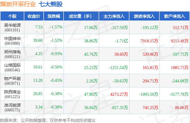 个股表现方面,煤炭开采行业当日领跌股为昊华能源(601101),该股当日报收7.53,下跌1.57%,成交量17.06万,主力资金净流出317.59万元。中国神华(601088)以下跌1.52%紧随其后,该股当日成交量38.86万,主力资金净流出1.71亿元。除此之外,郑州煤电(600121)、山煤国际(600546)、物产环能(603071)均进入当日熊股之列。具体个股列表见下表:
