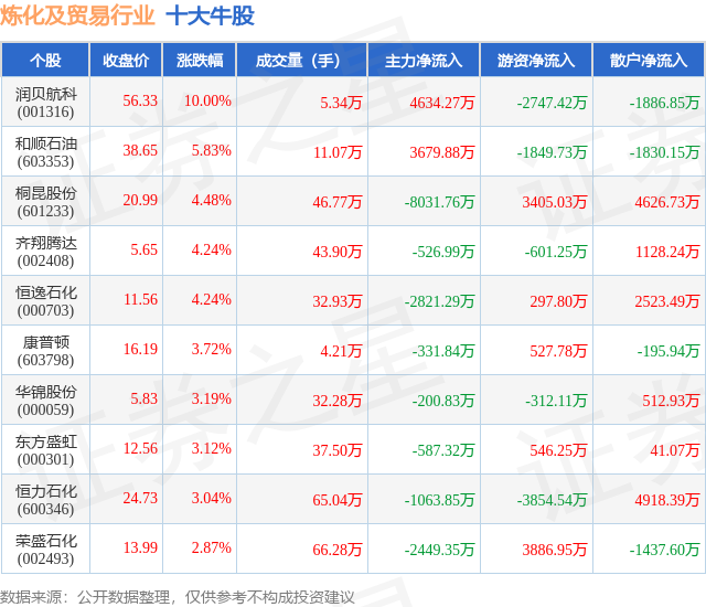 个股表现方面,炼化及贸易行业当日领涨股为润贝航科(001316),该股当日报收56.33,上涨10.0%,成交量5.34万,主力资金净流入4634.27万元。和顺石油(603353)以上涨5.83%紧随其后,该股当日成交量11.07万,主力资金净流入3679.88万元。除此之外,桐昆股份(601233)、齐翔腾达(002408)、恒逸石化(000703)均进入当日牛股之列。具体个股列表见下表: