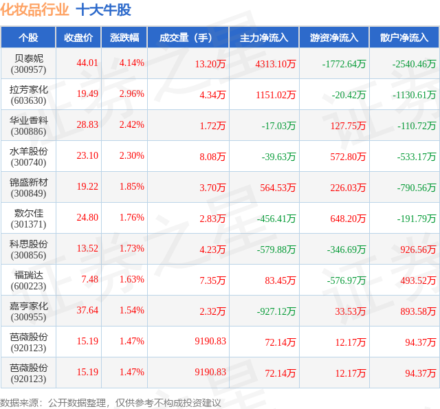 个股表现方面,化妆品行业当日领涨股为贝泰妮(300957),该股当日报收44.01,上涨4.14%,成交量13.2万,主力资金净流入4313.1万元。拉芳家化(603630)以上涨2.96%紧随其后,该股当日成交量4.34万,主力资金净流入1151.02万元。除此之外,华业香料(300886)、水羊股份(300740)、锦盛新材(300849)均进入当日牛股之列。具体个股列表见下表: