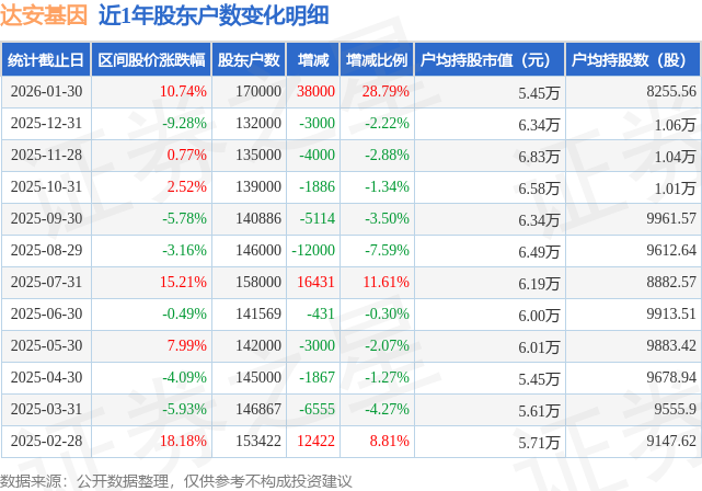 证券之星消息,近日达安基因披露,截至2026年1月30日公司股东户数为17.0万户,较12月31日增加3.8万户,增幅为28.79%。户均持股数量由上期的1.06万股减少至8256.0股,户均持股市值为5.45万元。