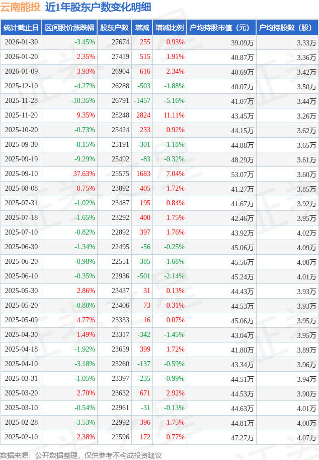 从股价来看,2026年1月20日至2026年1月30日,云南能投区间跌幅为3.45%,在此期间股东户数增加255.0户,增幅为0.93%。