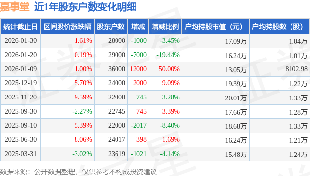 证券之星消息,近日嘉事堂披露,截至2026年1月30日公司股东户数为2.8万户,较1月20日减少1000.0户,减幅为3.45%。户均持股数量由上期的1.01万股增加至1.04万股,户均持股市值为17.09万元。
