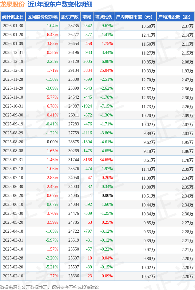 从股价来看,2026年1月20日至2026年1月30日,龙泉股份区间跌幅为1.04%,在此期间股东户数减少2542.0户,减幅为9.67%。