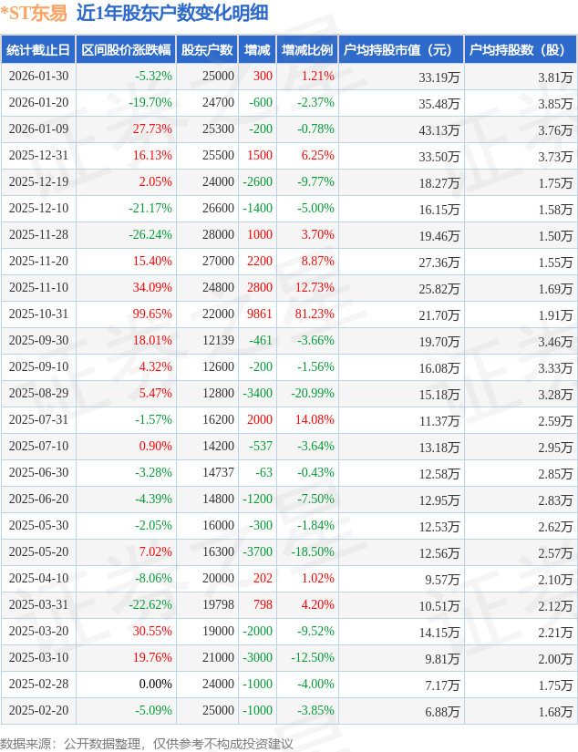 证券之星消息,近日*ST东易披露,截至2026年1月30日公司股东户数为2.5万户,较1月20日增加300.0户,增幅为1.21%。户均持股数量由上期的3.85万股减少至3.81万股,户均持股市值为33.19万元。