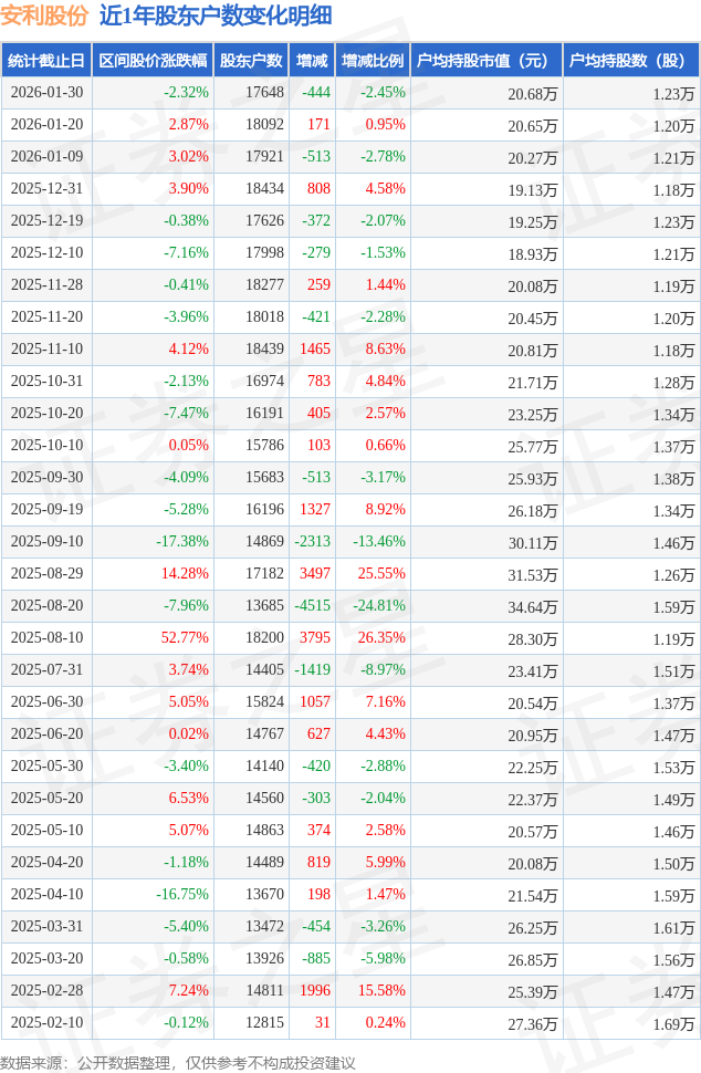 从股价来看,2026年1月20日至2026年1月30日,安利股份区间跌幅为2.32%,在此期间股东户数减少444.0户,减幅为2.45%。