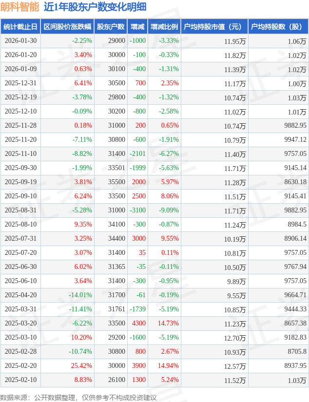 证券之星消息,近日朗科智能披露,截至2026年1月30日公司股东户数为2.9万户,较1月20日减少1000.0户,减幅为3.33%。户均持股数量由上期的1.02万股增加至1.06万股,户均持股市值为11.95万元。