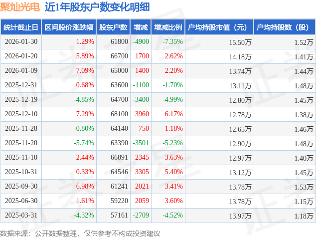 从股价来看,2026年1月20日至2026年1月30日,聚灿光电区间涨幅为1.29%,在此期间股东户数减少4900.0户,减幅为7.35%。