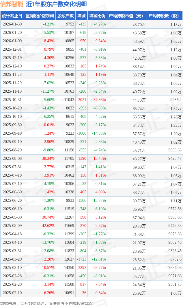 从股价来看,2026年1月20日至2026年1月30日,信邦智能区间跌幅为4.21%,在此期间股东户数减少435.0户,减幅为4.27%。