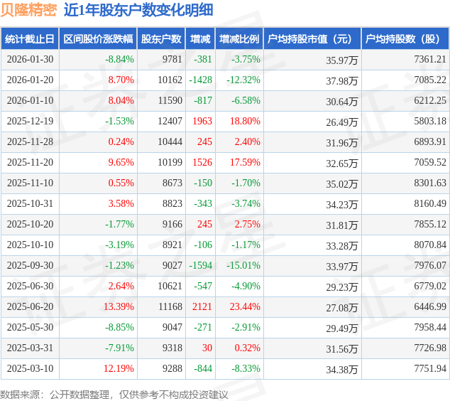 从股价来看,2026年1月20日至2026年1月30日,贝隆精密区间跌幅为8.84%,在此期间股东户数减少381.0户,减幅为3.75%。